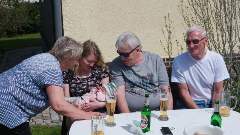 Naja, wie dem auch sei. Pünktlich um die Mittagszeit trudelten die drei ein. Mir fiel augenblicklich auf, dass sie älter waren als die anderen Mitglieder meiner Familie. Möglicherweise steht das Groß für älter? Wie immer wurde ich im Anschluss rumgereicht, jeder wollte ein Stück von meiner Schönheit erhaschen. Großopi Heinz war nicht der geschickteste und schüttelte mich ordentlich durch. Es ging hoch und runter, ich wusste gar nicht mehr so recht wo oben und unten war. Mir war inzwischen etwas flau im Magen doch ich nahm alles zusammen und brachte mein hübschestes Lächeln hervor. Als Mama dann aber ankam, um mich an Großopi Achim zu übergeben, sah ich die Katastrophe langsam aber sicher kommen. Es schaukelte wieder abenteuerlich. Ich merkte, wie die süße Milch vom Mittagessen langsam aber stetig ihren Weg nach oben erklomm. Idealerweise erreichte sie den Gipfel, als ich gerade in die Arme vom Opi übergeben wurde. Die Schamesröte zeichnete mein Gesicht, sowas war mir bislang noch nie passiert. Opi hatte einen Fleck hier, etwas säuerlich riechende Milch da. Im Nachhinein bin ich sehr glücklich, dass er nicht instinktiv seine Arme weggezogen hat. Nur so konnte ein Unglück verhindert werden. Er war sozusagen mein Retter in dieser Situation, weshalb ich mein Herz schon jetzt an Achim verloren habe.