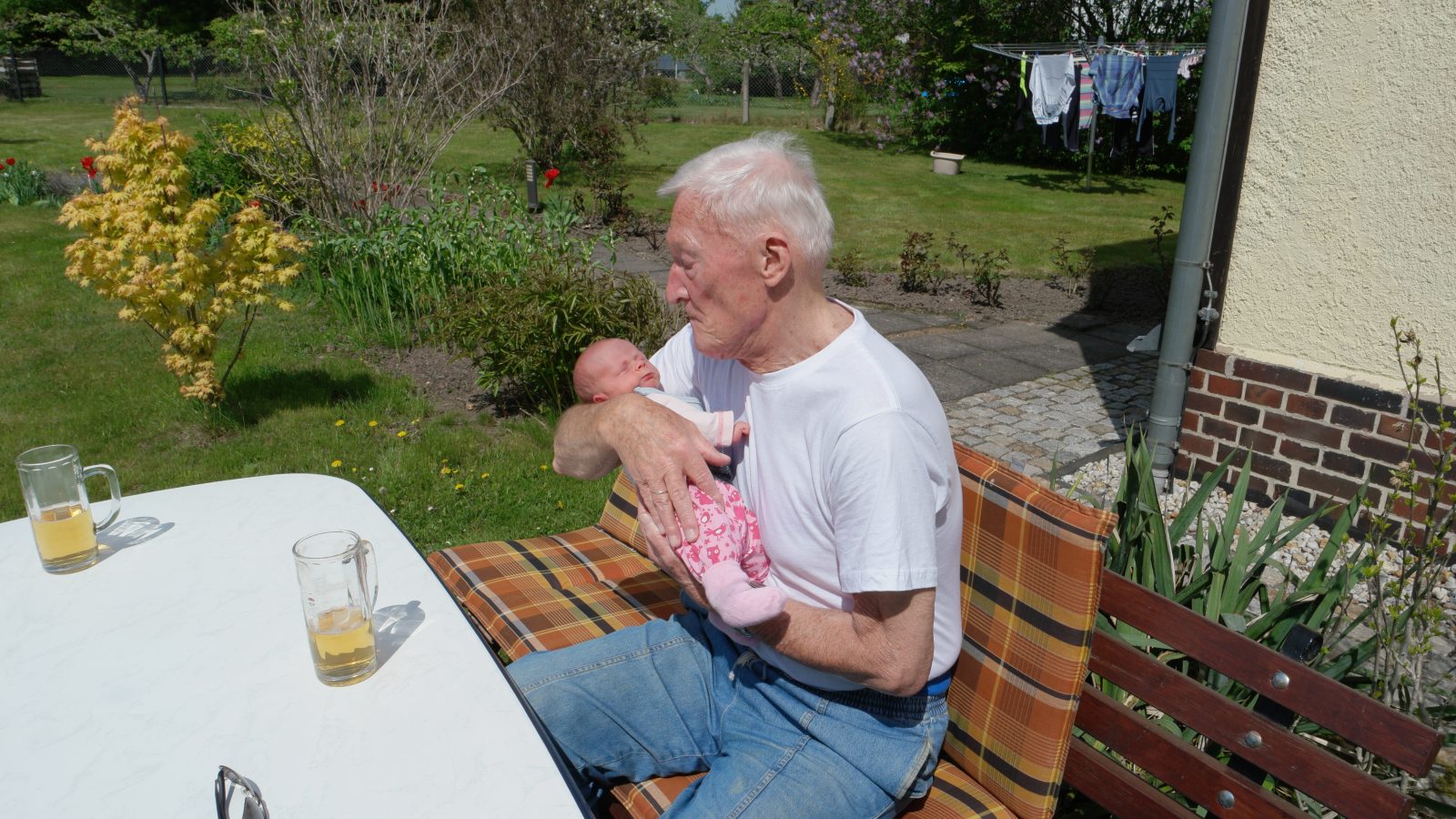 Naja, wie dem auch sei. Pünktlich um die Mittagszeit trudelten die drei ein. Mir fiel augenblicklich auf, dass sie älter waren als die anderen Mitglieder meiner Familie. Möglicherweise steht das Groß für älter? Wie immer wurde ich im Anschluss rumgereicht, jeder wollte ein Stück von meiner Schönheit erhaschen. Großopi Heinz war nicht der geschickteste und schüttelte mich ordentlich durch. Es ging hoch und runter, ich wusste gar nicht mehr so recht wo oben und unten war. Mir war inzwischen etwas flau im Magen doch ich nahm alles zusammen und brachte mein hübschestes Lächeln hervor. Als Mama dann aber ankam, um mich an Großopi Achim zu übergeben, sah ich die Katastrophe langsam aber sicher kommen. Es schaukelte wieder abenteuerlich. Ich merkte, wie die süße Milch vom Mittagessen langsam aber stetig ihren Weg nach oben erklomm. Idealerweise erreichte sie den Gipfel, als ich gerade in die Arme vom Opi übergeben wurde. Die Schamesröte zeichnete mein Gesicht, sowas war mir bislang noch nie passiert. Opi hatte einen Fleck hier, etwas säuerlich riechende Milch da. Im Nachhinein bin ich sehr glücklich, dass er nicht instinktiv seine Arme weggezogen hat. Nur so konnte ein Unglück verhindert werden. Er war sozusagen mein Retter in dieser Situation, weshalb ich mein Herz schon jetzt an Achim verloren habe.