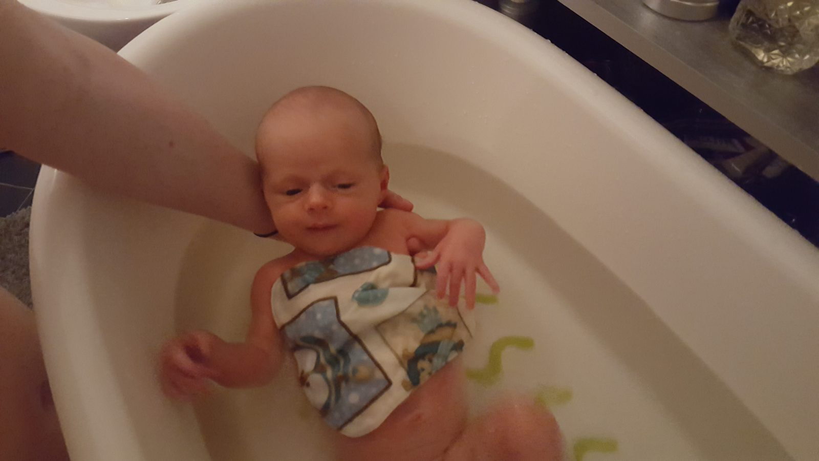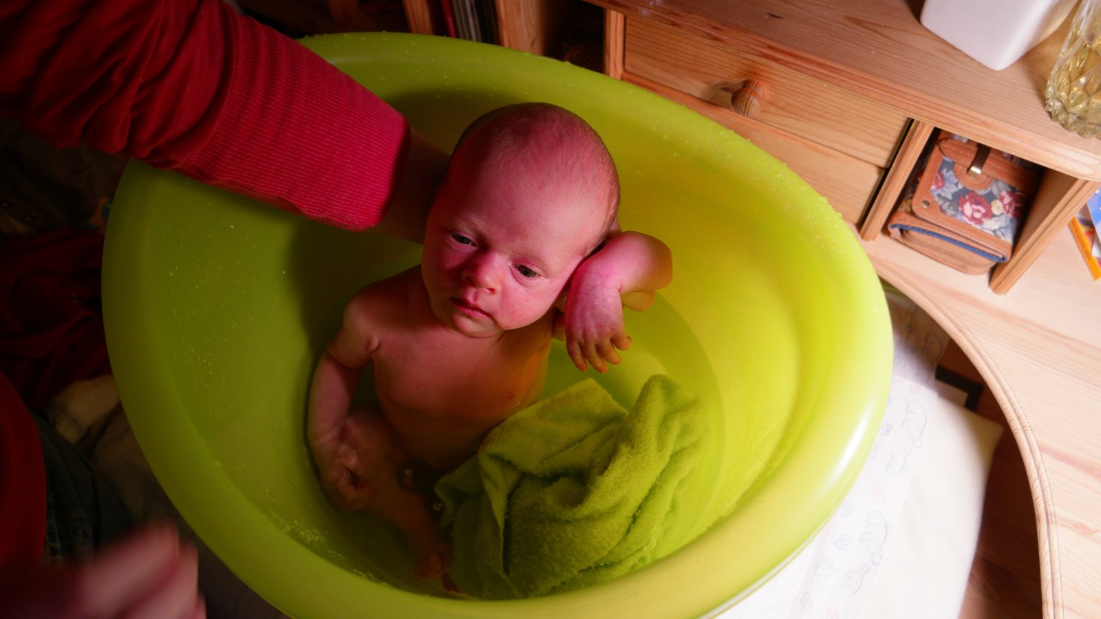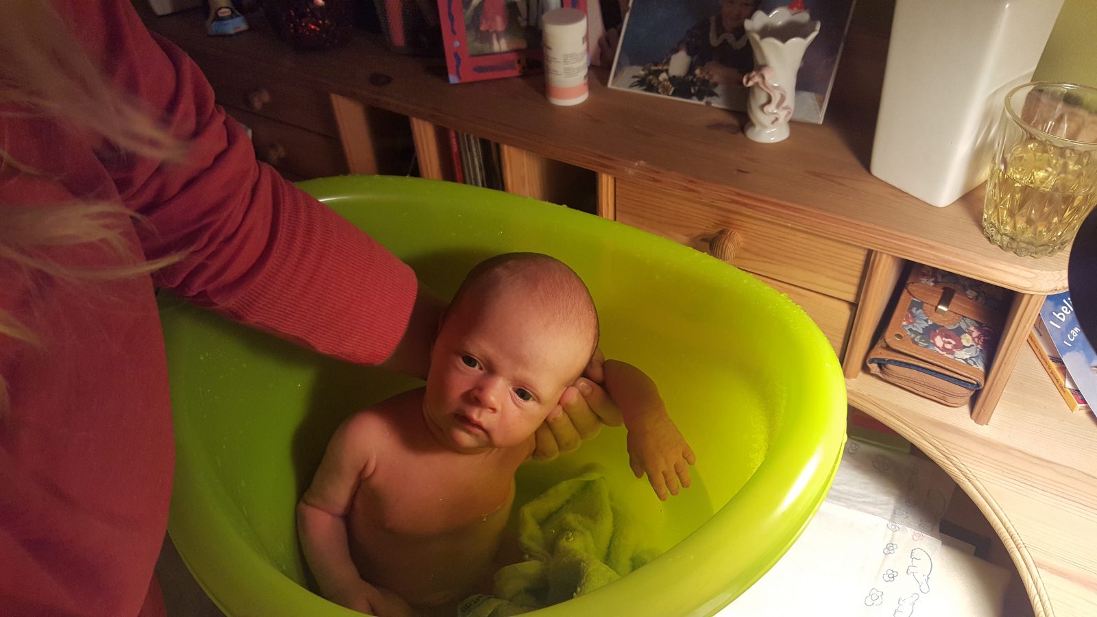 Der Abend war dann auch ein Heimspiel. Alles konzentrierte sich stundenlang auf mich. Im Nachhinein muss ich sagen, dass ich mich davon zu sehr ablenken lies und mein gesundes Misstrauen vernachlässigte. Ich ahnte nichts Schlimmes, als Mama mich auszog. Im Augenwinkel konnte ich nur schemenhaft erkennen, wie Oma Anett mit einem grünen Gegenstand ins Zimmer kam. Mami hob mich und schneller, als ich es realisieren konnte, saß ich in diesem grünen Ding drin. Meine Füße waren nass, meine Beine waren nass, ja sogar mein Popo war nass. Was machten die denn da mit mir? Reflexartig fing ich an zu schreien. Leute, hört auf, ich kann doch noch nicht schwimmen. Meine Angst wich aber binnen weniger Sekunden. Es war warm und angenehm und vermutlich hat auch keiner gemerkt, dass ich es hab laufen lassen. Es war einfach zu entspannend. Mit großen Augen begann ich zu dösen, doch dann kam wieder Knips-Dings-Opa-Uwe um die Ecke und machte die entspannte Stimmung zu nichte. #DankeOpa